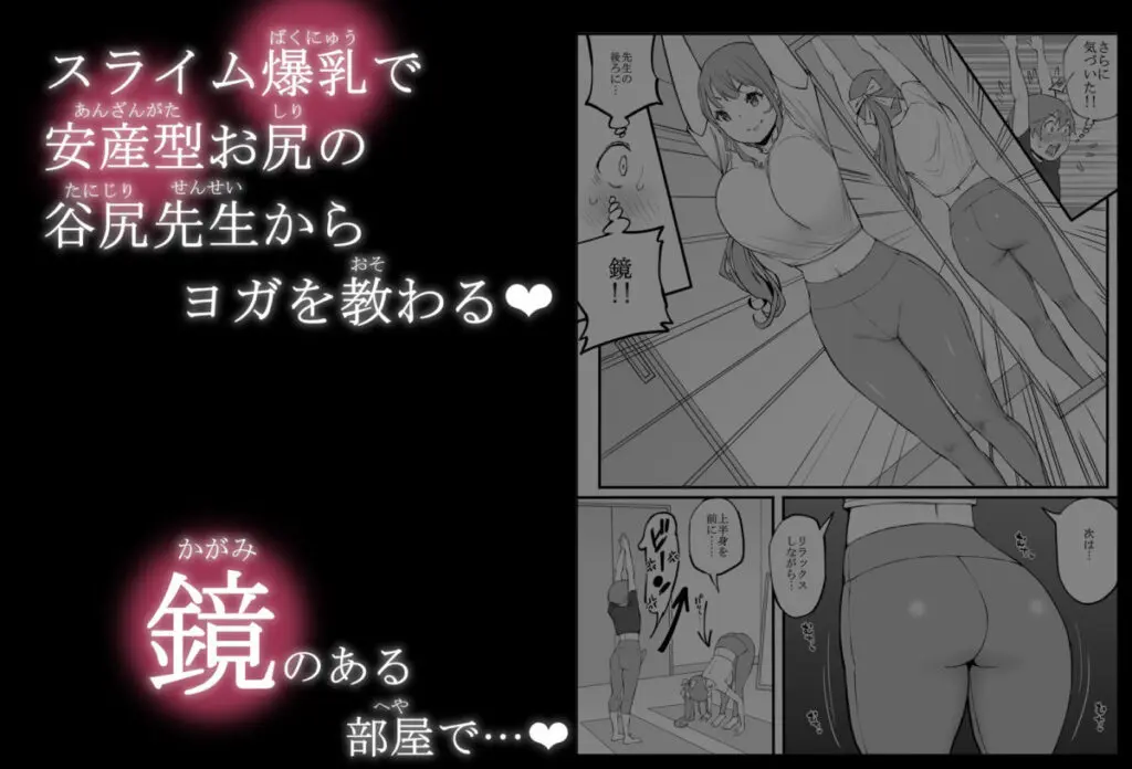 ピチピチのフィットネス衣装を身にまとった先生と自宅でマンツーマン・ヨガをすることになった主人公。ヨガの最中に押しつぶされるスライムおっぱい、突き出される大きなお尻。葛藤する主人公の理性を、じっくりねっとりいたずらに弄ぶ内容となっています。