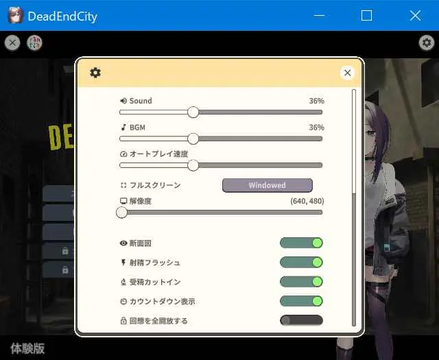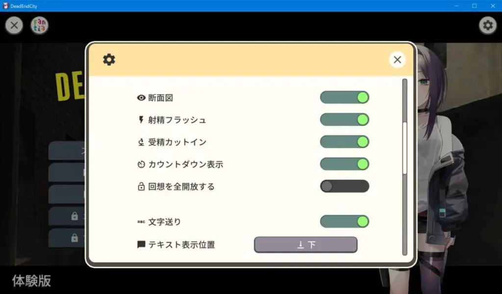 射精時の画面のホワイトアウトや断面図の有無、回想全開放ボタンもあり。この体験版でも開放可能です。珍しいところで、射精までのカウントダウン機能なんてものもあります。