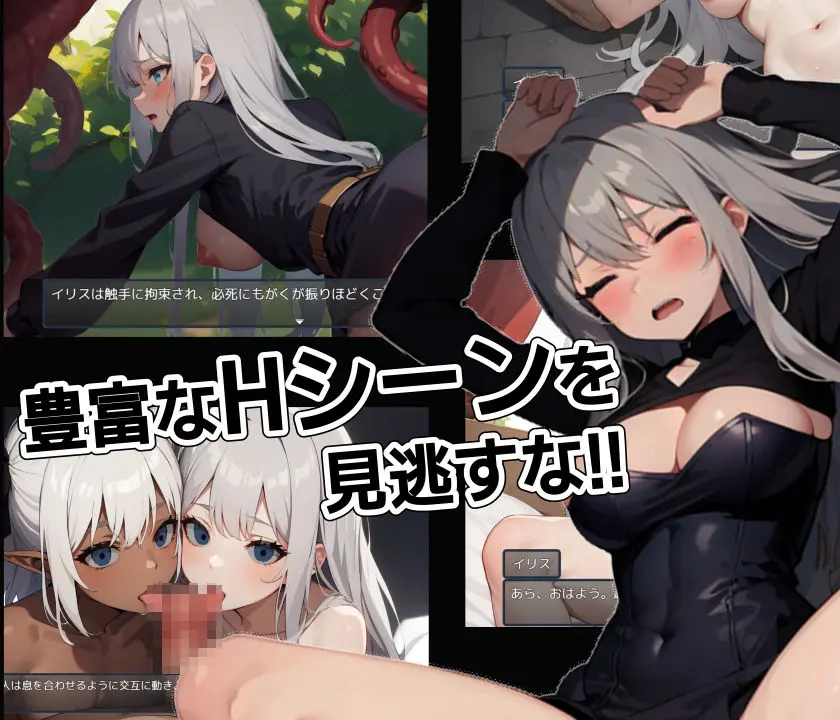 Hシーンは敗北エロの他、冒険の日銭を稼ぐため娼館や街の男たちに体を差しだす身売り系のイベントも多数ある。こちらの作品は精製AIによるCGに加筆を加え、差分CGも多数増やし、1シーンのボリュームをうまく確保している。