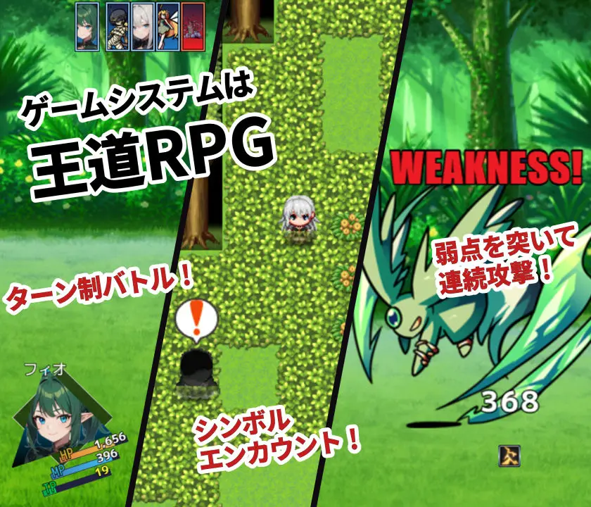 バトルはシンボルエンカウントから始まるオーソドックスなターン制バトル。敵のウィークポイントを突いて連続攻撃を叩き込めるシステムを織り込んでいる。