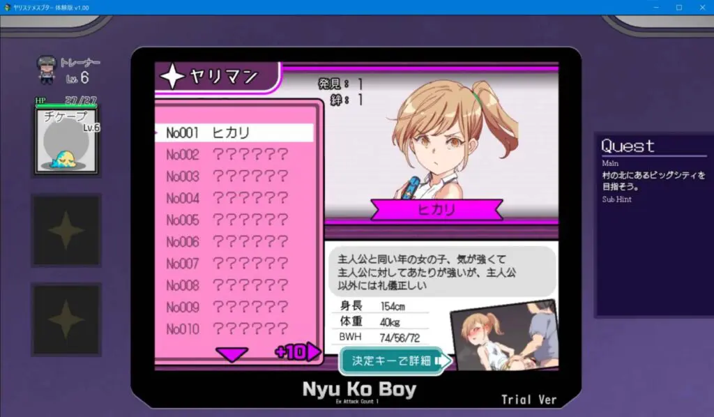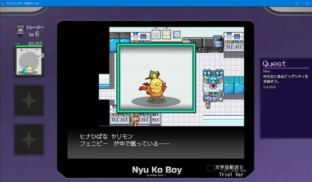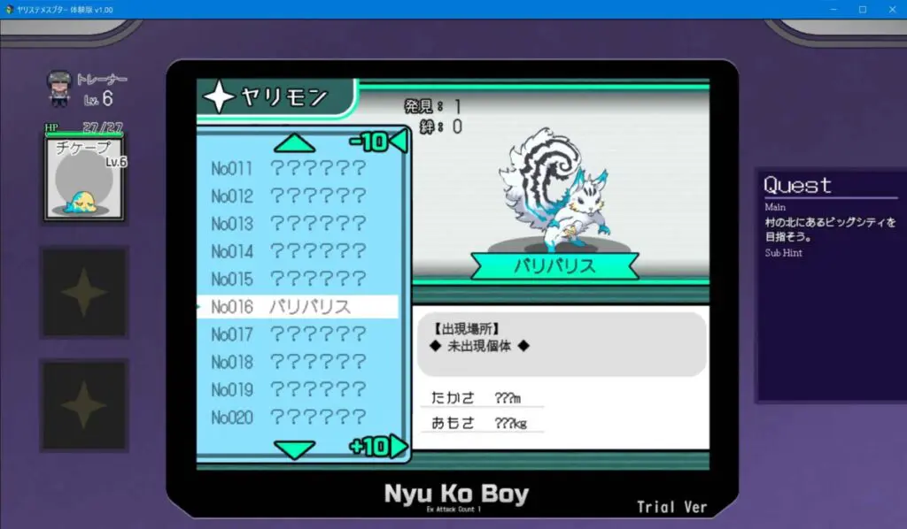 出会ったヤリモンや捕まえたヤリモンの情報が観ることが可能。その他にも出現場所や、そのフィールド内で登場するヤリモンたちを右下に可視化してくれる嬉しい機能。初代オマージュで全部で151匹いるようだ。
