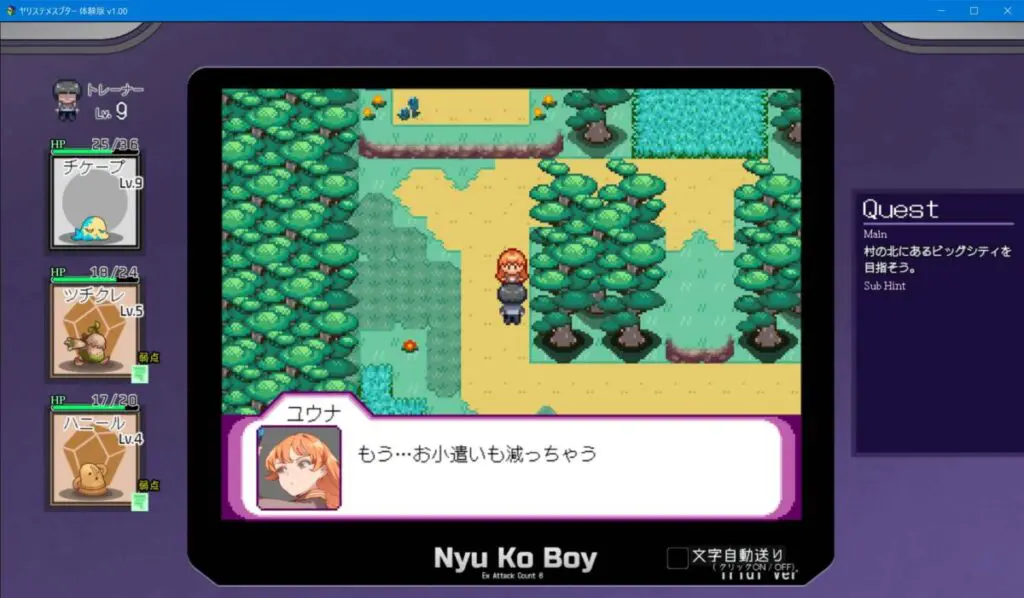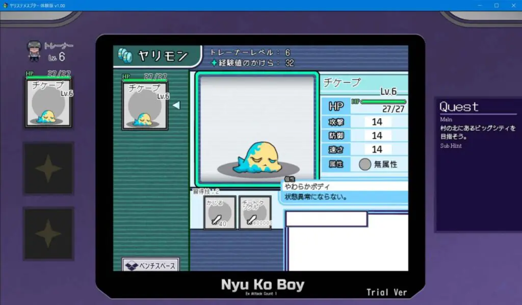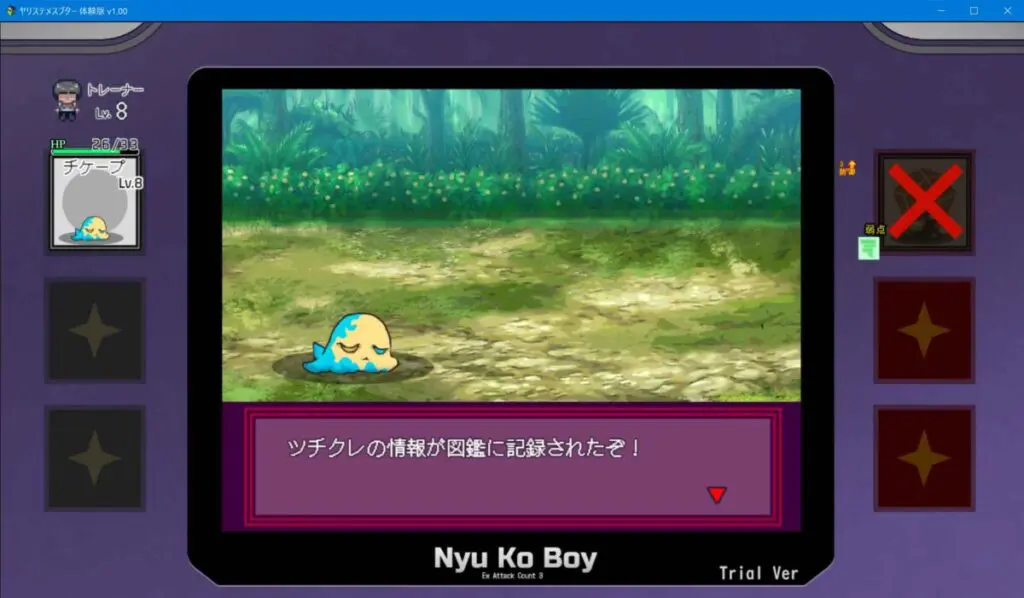 戦闘もタイマンならサクサクっと。3VS3などの複数バトルになると確殺可能なチートタックルをどうやって決めて勝つか。を主軸にケチープ以外のヤリモンの相性・技を組み立てるのが面白い。逆にチートタックル無しで純粋なバトルで戦ってもそれはそれで面白そうだ。